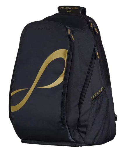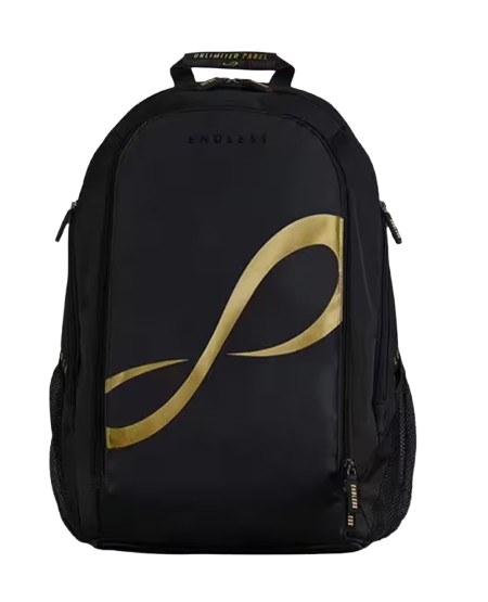 Mochila Endless de pádel con logo dorado, diseñada para quienes buscan elegancia, funcionalidad y rendimiento tanto dentro como fuera de la pista. Su diseño moderno y sofisticado, con el logo Endless en acabado dorado, aporta un estilo premium sin renunciar a la practicidad.